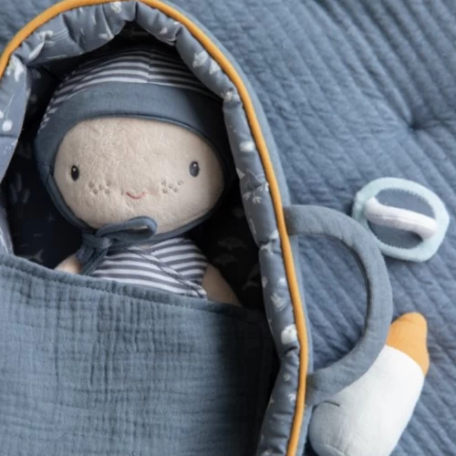 Meet little baby Jim. This sweet Little Dutch plush doll wants to be cuddled and carried around. Baby Jim will become friends with every little girl or boy. They can feed him with the bottle or calm him down with the dummy. They can change his nappy, put on a cap, and tuck him in with a blanket. Baby Jim also enjoys going on a trip in his cute travel basket. By looking after Jim, children learn to take up a caring role in a playful way. They can tell baby Jim all their secrets. He wonβt tell anyone. He is wonderfully soft to nestle up against, which gives children a feeling of safety.
