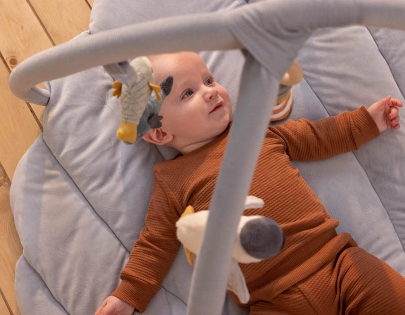 Exploring. This engaging play mat challenges your little one to move, reach and grab. The super soft shell shaped mat has a harbor inspired theme with 5 different cuddly toys hanging from 2 corduroy arches. The gull, pelican, lighthouse, sailboat and fish will entertain your child endlessly.Β