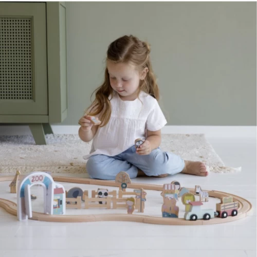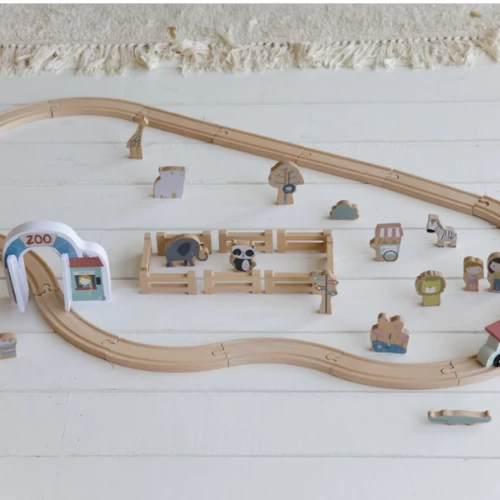 These wooden animals and zoo items are a perfect addition to the railway train. Make the final destination of the train a day of fun in the zoo! Designed for your child to express his/her endless imagination. This set of 28 items includes a ticket station, a maintenance truck with trailer, 10 animals, 2 figurines, an ice cream stall and more. Each animal fits into the trailer for many hours of fun play. The vehicles are compatible with the rails, allowing them to drive around the zoo. Additional railway playsets are available.