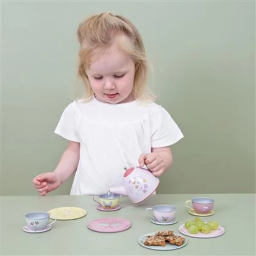 Let’s have some tea together! Join your child in a wonderful role-playing tea party with this lovely tin tea set illustrated with flowers and butterflies. This tea set sparks children’s imagination and stimulates their fine motor skills. The set consists of four small tea cups, four saucers, four pastry plates and a teapot with lid. For children from the age of 3 years. WARNING: Do not use with real food/water or a real stove/oven.